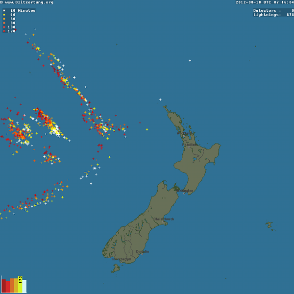 We have started our lightning location in New Zealand. The first lightning discharges are computed from the data of three detectors located at Hamilton, Aukland, and Kerikeri.
