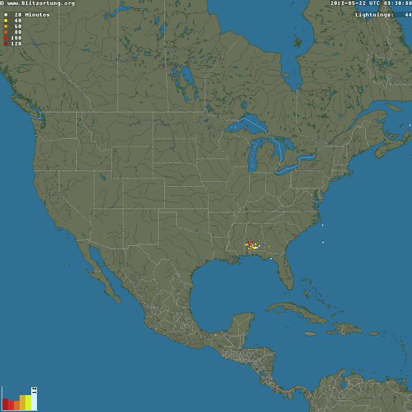 We have started our lightning location in North America. The first lightning discharges are computed from the data of three detectors located at San Antonio/Texas, Salt Lake City/Utha, and Palm Beach Gardens/Florida.