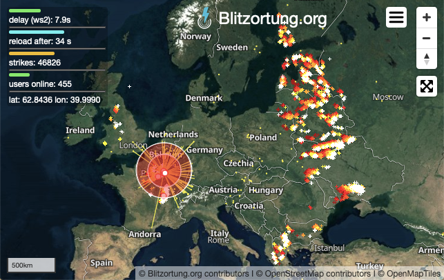 To see lightning in almost real-time, we have added a new animation. Each lightning strike is marked with a white expanding circle. The locations of the stations involved with the computation are visualized by green and blue lines. The blue lines are pointing to the stations whose information is definitely used. These are at most 12 of the nearest stations. The green lines are pointing to the stations that also have received the strike. The delay is usually between 3 and 6 seconds. If the storm is more than 2 km away, it can be seen earlier on the map as the thunder is heard.